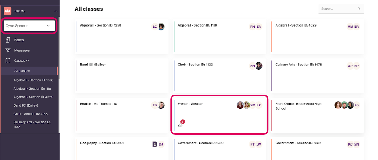 After logging in at id.thrillshare.com you'll be directed to the Classes page. This will include all published classes from your student's teachers. Each student has a separate group of classes, switch between students by clicking their name in the left menu bar.
