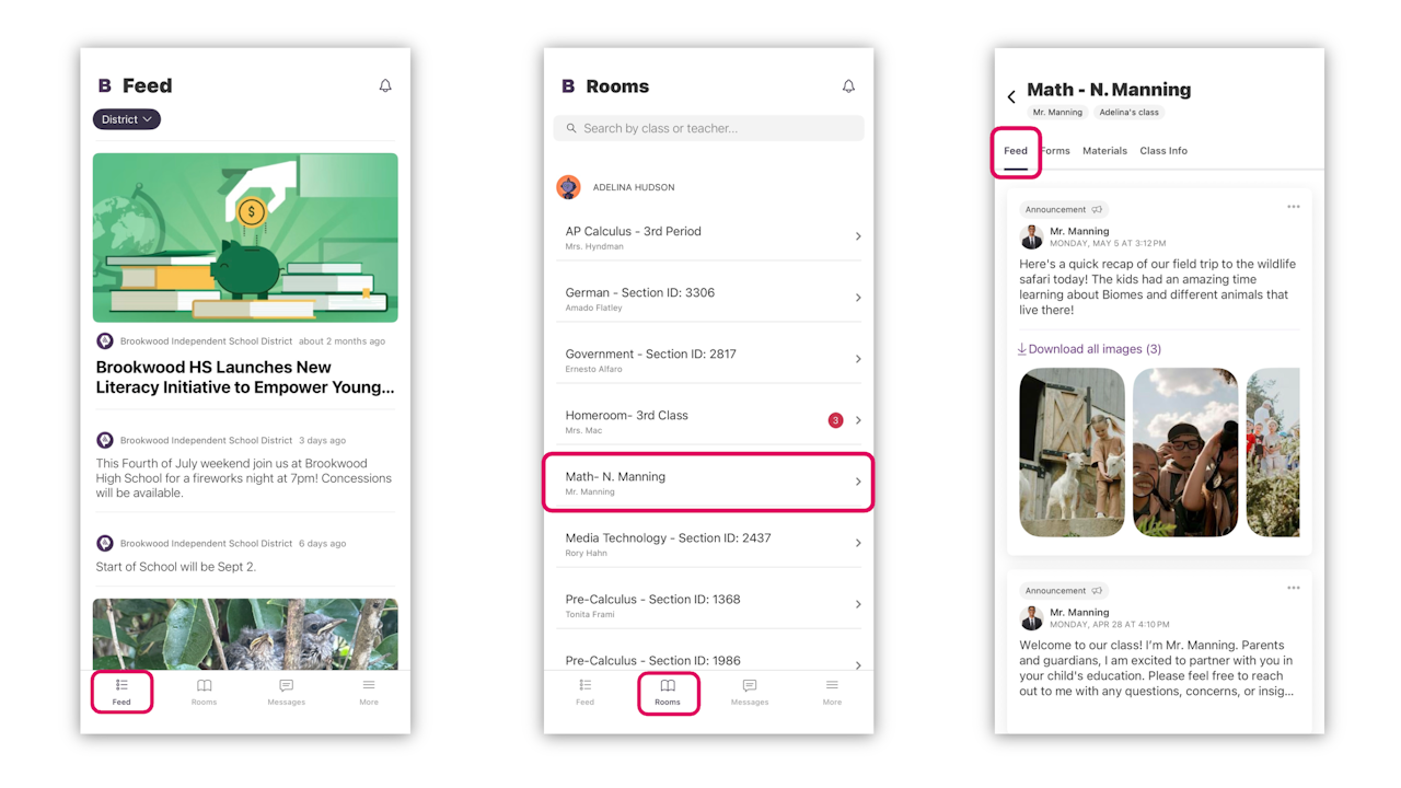 When you've successfully signed in, you will be given the list of rooms that your child is a part of. Clicking into a class will show the options for Stream and Class Info, and depending on the class, Behavior and Materials.