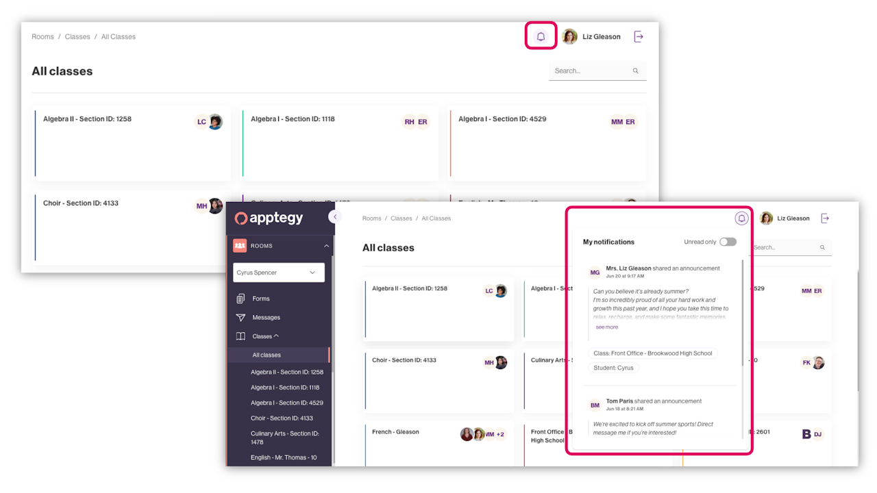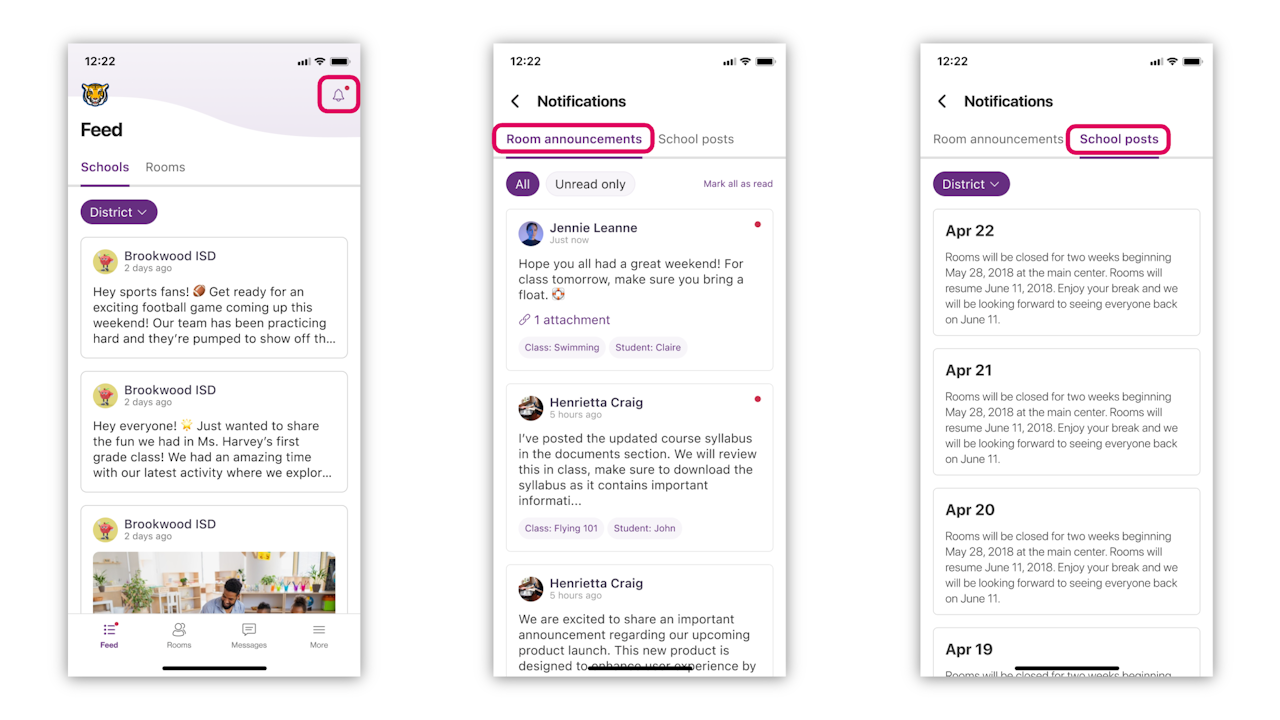 Hay diversas maneras en que se le notificará cuando reciba un mensaje en Rooms o cuando un maestro publique anuncios. Tanto en la web como en dispositivos móviles, verá insignias rojas en cada Clase en la que tenga contenido sin leer. ¡Haga clic a continuación para obtener información sobre cómo habilitar las notificaciones automáticas en la aplicación de su distrito!